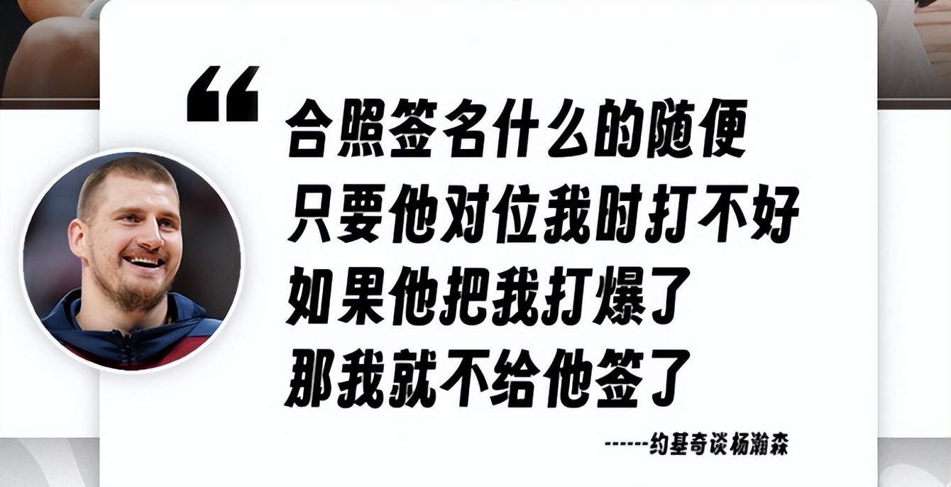 As we all know, Yang Hansen has long been hailed as "Chinese Jokic" by the outside world. One of his templates during the draft was Jokic. It can even be said that Jokic is Yang Hansen's ultimate template. When Jokic started his trip to China this summer, when talking about Yang Hansen's NBA prospects, he humorously said, "It doesn't matter whether he takes a photo or autographs, as long as he doesn't play well against me. If he beats me, then I won't sign him."