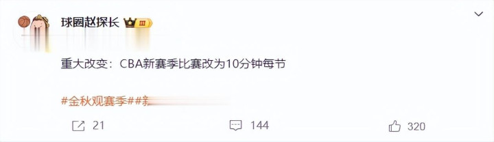 During this offseason of the CBA League, the Basketball Association has been trying to make changes, and is likely to expand or resume promotion and relegation in the next one or two years. In addition, the topic of shortening the single quarter time to 10 minutes has been discussed for some time, and now there is a definite answer. According to the media person "Inspector Zhao of the Ball Circle", the new season will be officially implemented. This change in the CBA league has triggered heated discussions among the media and fans. Many fans do not support this approach and believe that under the current foreign aid policy of seven players in four quarters, it is not conducive to the cultivation of domestic players. In fact, the Basketball Association led this change, mainly to bring the CBA league closer to FIBA competitions, improve the transition speed and intensity of the competition, and make national team players more adaptable to international competitions.