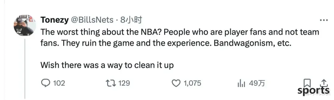 A netizen named Tonezy said on X: "The worst thing about the NBA is those player fans. They do not support the team, they only support the players. They ruined the game and viewing experience, and they are all followers. I hope there is a way to clean up these people."