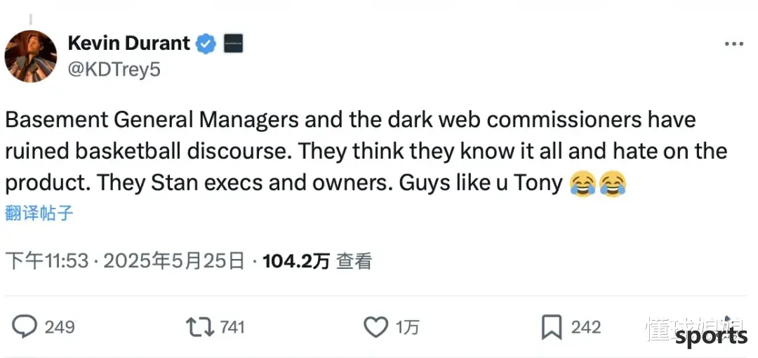 I immediately got Durant's reply! Durant replied: "Those 'keyboard general manager' and 'dark web president' are the people who ruined the basketball discussion environment. They think they understand the ball, but they only criticize them without thinking. They pursue management and bosses, like you, Tony."