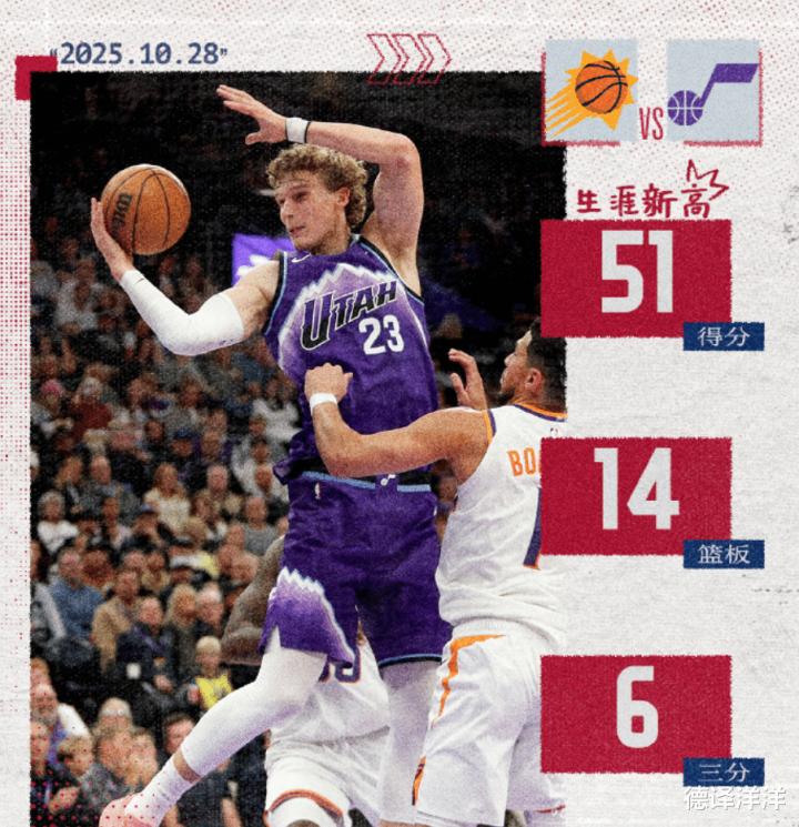 This season, the Jazz want a record, and Markkanen is also going all out. He started 45 minutes today and scored 51 points, 14 rebounds and 3 assists on 14 of 32 shots, beating Booker's 34 points, 5 rebounds and 10 assists. Markkanen scored consecutively at critical moments, withstood the Suns' counterattack, and ultimately helped the Jazz win the game.