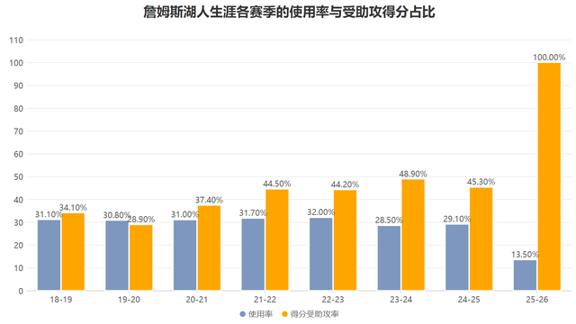 The second is to reduce his own shots, especially difficult shots, to ensure higher scoring efficiency. James' usage rate in this game is only 13.5%, and his scoring assist rate in this game has reached 100%, which means that James's usage rate in this game has reached 100%. James consumes fewer shots and scores in sports games all come from ball-conduction cooperation with teammates. Although one game cannot determine everything, it at least shows James' changes: reducing difficult singles with the ball and increasing the number of catches and finishings to make more positive contributions by enhancing scoring efficiency. These can show that James has given up the ball-holding style and increased his off-ball offense to adapt to the new Lakers system.