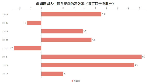 James, who has changed his playing style, also has a strong positive effect on the court. Due to his further aging and his opponents, his defensive efficiency in this battle was only 128.4, but at the same time, his offensive efficiency also reached 133.8, which means As far as this battle is concerned, James cannot limit the opponent's scoring when he is on the court, but he can help the Lakers score more points to achieve a positive effect. The 5.5 net efficiency also means that when James is on the court, the Lakers can beat their opponents by 5.5 points per 100 possessions. This net efficiency is also the highest in the past five seasons.
