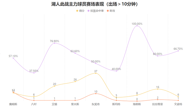 In this battle, James only took 7 shots, hit 4 goals and scored 11 points. To be fair, this score is really not high, but James sent the team's most 12 assists. With his help, the Lakers also completed the reversal through an offensive climax in the second half. The performance in this battle is also not a classic data in James' career: low shots, low points, high assists.