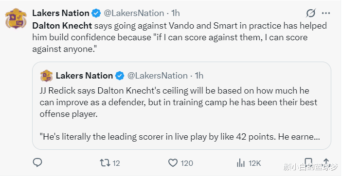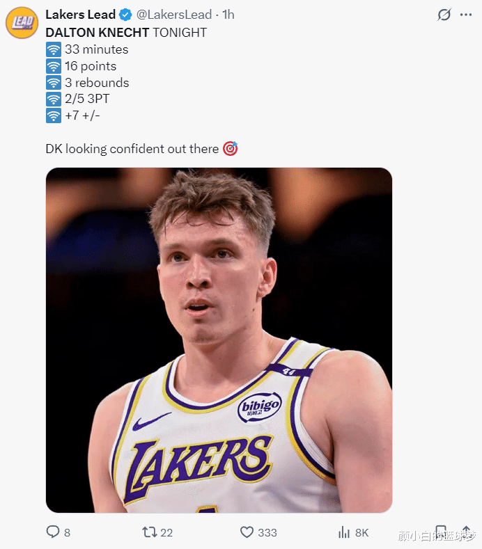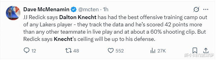 Redick commented on Knecht after the game: Among all Lakers players, Knecht was actually the best offensive player in the training camp. The team also tracked data. He scored 42 points more than other teammates in actual combat and shot about 60% from the field. However, his defense is the key to improving his upper limit.