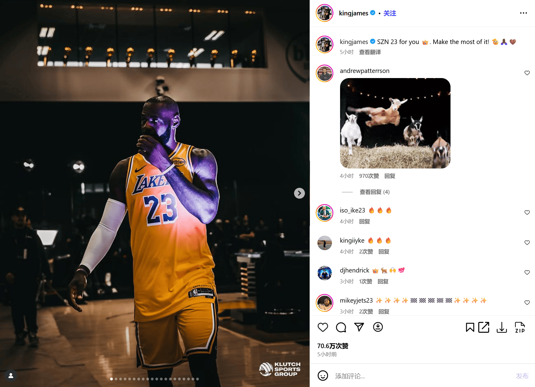 On October 3, there are only 19 days left before the start of the NBA regular season in the new season. Earlier today, Lakers star James updated his social media, posting his makeup photos this year to celebrate the start of his 23rd season, with teammate Reeves supporting him for GOAT.