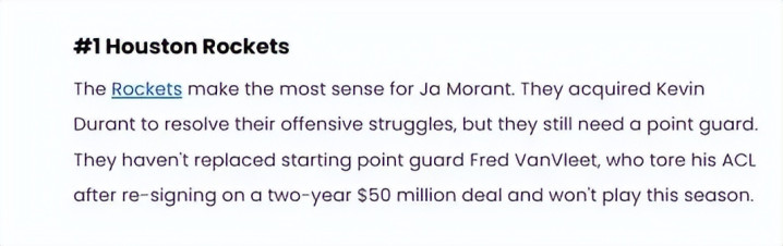 According to the latest report from the US media "Sportskeeda", the Rockets are currently The next team most likely to take over Morant even listed a detailed seven-for-one trade plan: