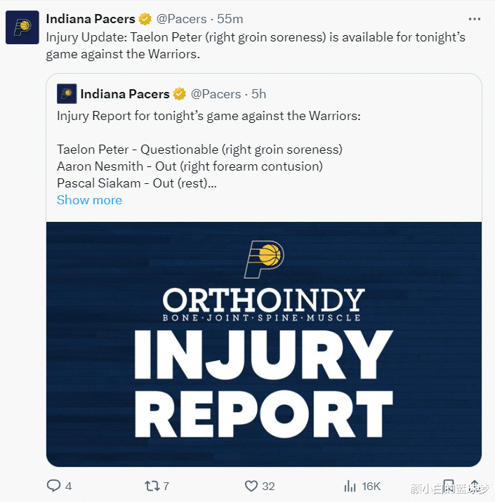The Pacers, who had nine injured players in the second quarter, made the newly signed Morris the leader of the second team. Morris scored 8 points in a single quarter, and Earl scored 6 points and 6 rebounds. Relying on the efforts of the Pacers' role players, the halftime gap was not widened to more than 10 points. For the Warriors, Butler has already reached double figures, Post also scored 9 points, and Cole has scored in all 10 rotations. At halftime, the Warriors led the Pacers 48-41.