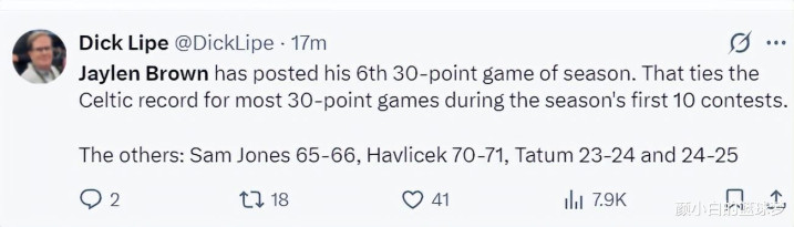 Green Kai reporter: Brown scored 30+ points in 6 of the first 10 games. This has tied the Green Kai team's record for the most 30+ points in the first 10 games, comparable to Sam Jones and Tatum.