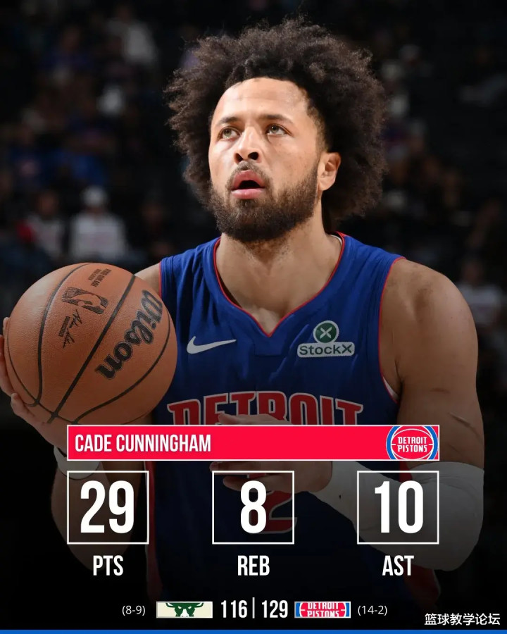 After three quarters, the Pistons led 104-85 by 19 points. There was actually not much suspense in the fourth quarter. The Pistons' main force went up to play for a while and officially took away the game. At the end of the game, the Pistons defeated the Bucks 129-116. The Pistons have won 12 consecutive games, ranking first in the Eastern Conference with 14 wins and 2 losses. The Pistons are 3 games ahead of the second-placed Raptors, and their advantage is relatively obvious.