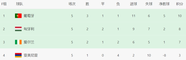 In this game, Portugal had a ball possession rate of 77% and scored 0 goals in 27 shots. Ireland scored 2 goals on 14 shots. The 40-year-old Ronaldo was disappointing. He became one of the biggest culprits in the loss. He took 5 shots, 1 shot on target, 0 goals, and a red card. This game also messed up the qualifying situation, with Portugal, Hungary and Ireland all hoping to advance directly. However, it is Portugal that still holds the initiative. After all, Portugal still ranks first in the group, and faced the very weak Armenia in the last round.
