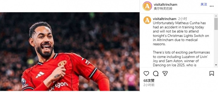 Cunha originally planned to attend an event hosted by Manchester to light up Christmas lights, but the organizer confirmed on social media: "Cunha is unable to attend due to medical reasons because he had an accident during training."