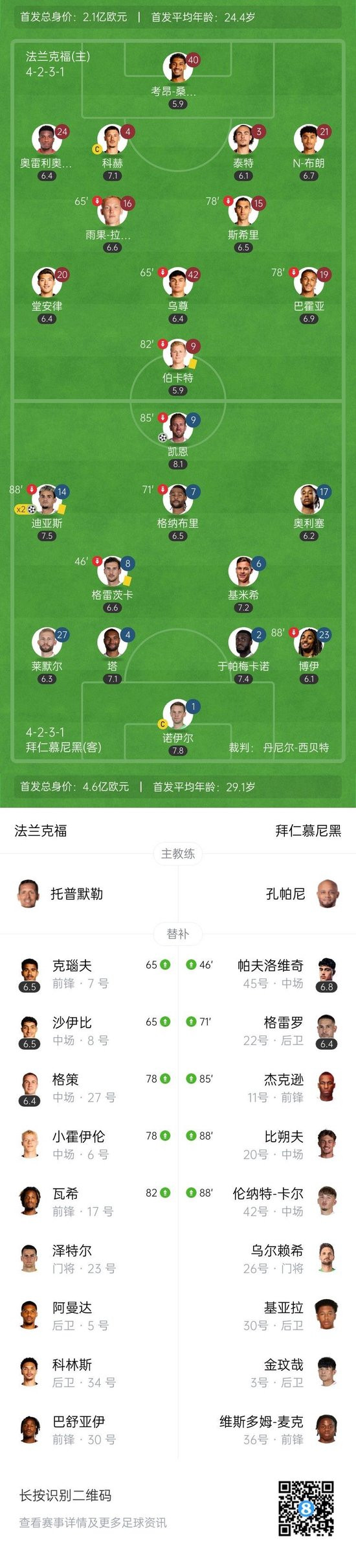4 minutes of injury time in the second half, and the whole game ended, and Bayern 3-0 Frankfurt.