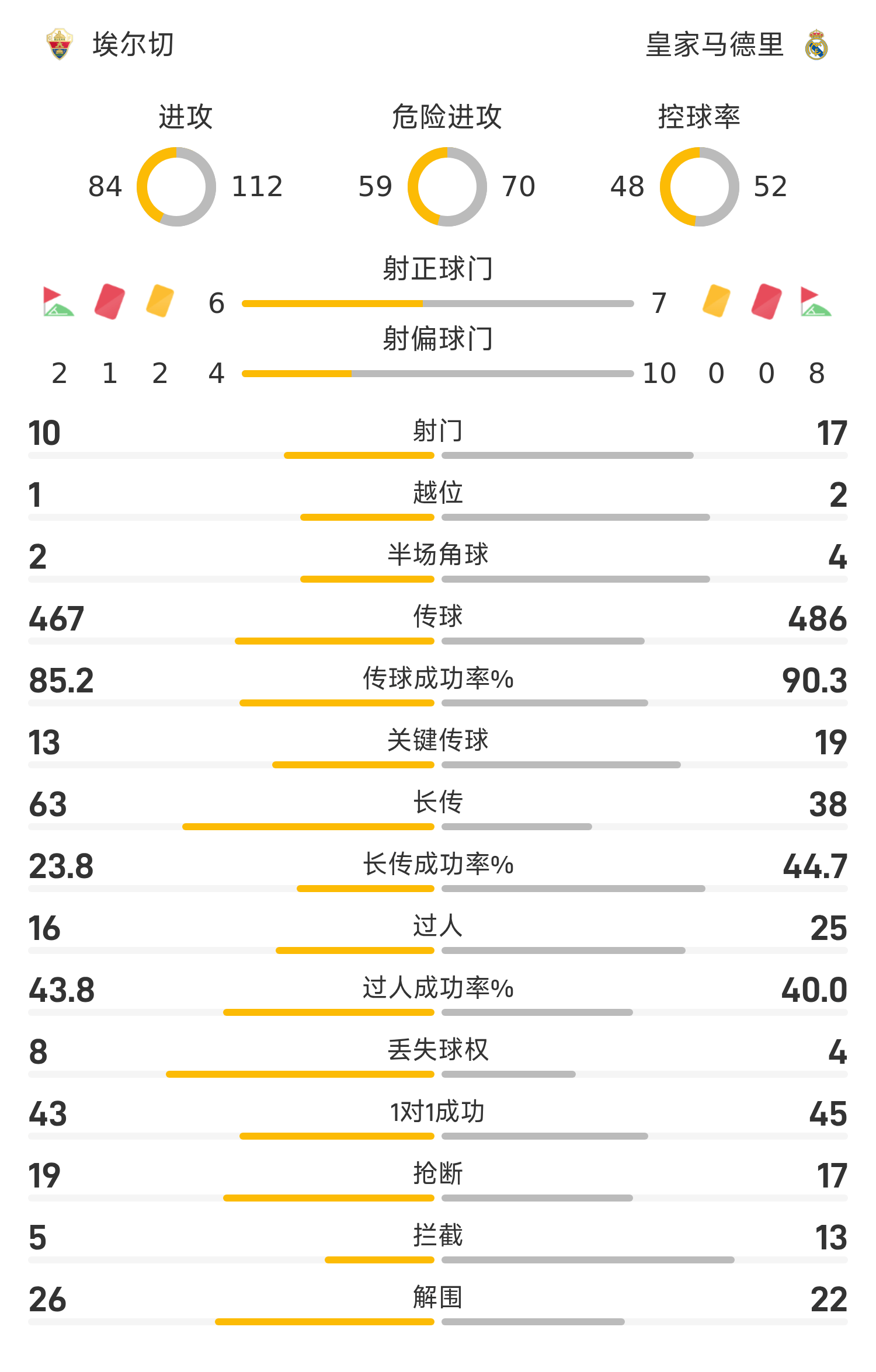 Then the game entered the performance time of the goalkeepers of both sides. Real Madrid's Courtois used his feet to block the threatening close-range shots of Rafa Mir and Andre Silva. Elche's goalkeeper Peña did not give up too much. He first attacked to resolve Mbappe's single-handed ball, and then brilliantly saved Mbappe's volley in the penalty area. Asensio's header and Alda Guler's long shot also missed the goal.