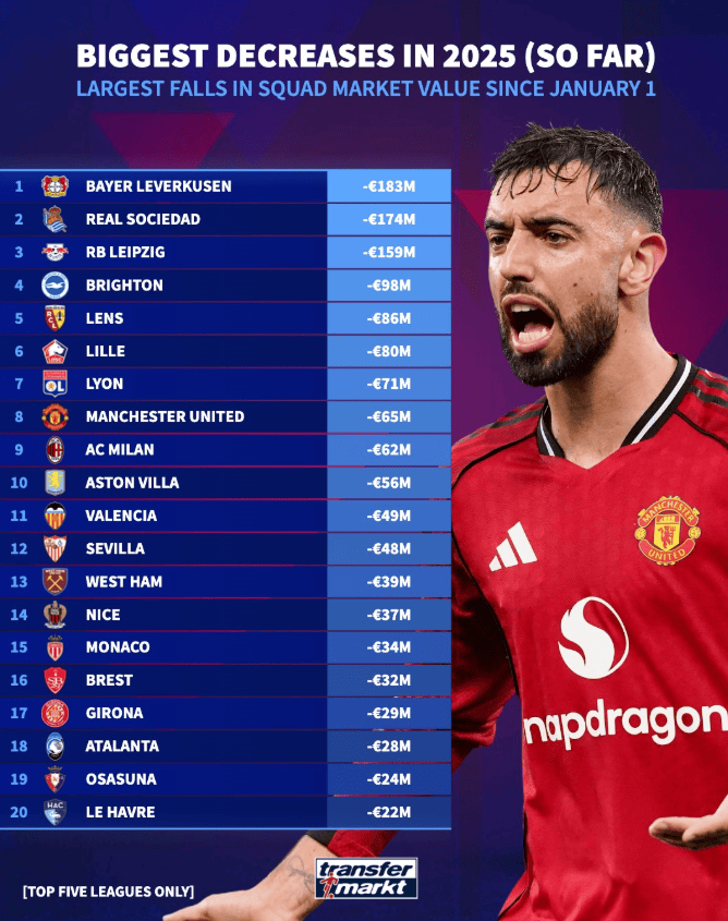Club value decline list in 25 years: Leverkusen/Royal Society/Leipzig top 3; Manchester United 8th