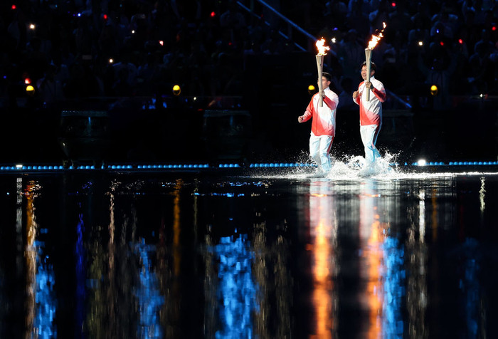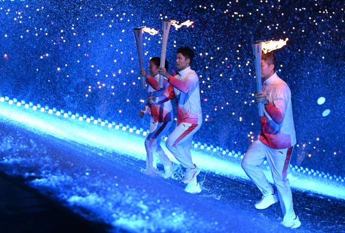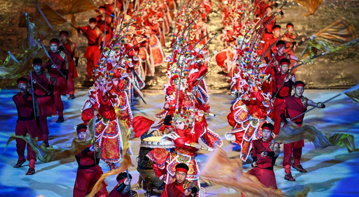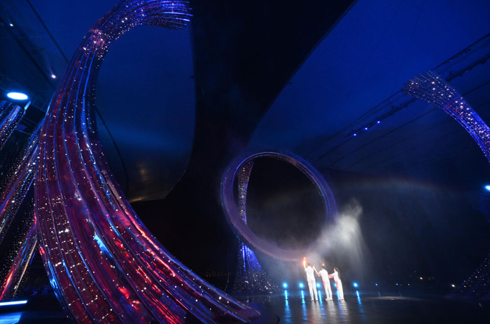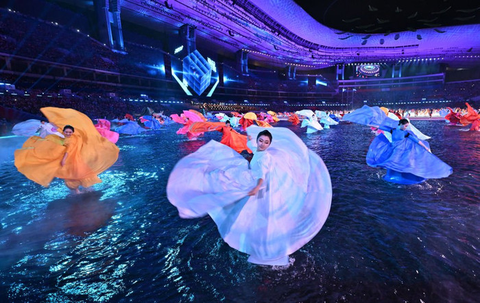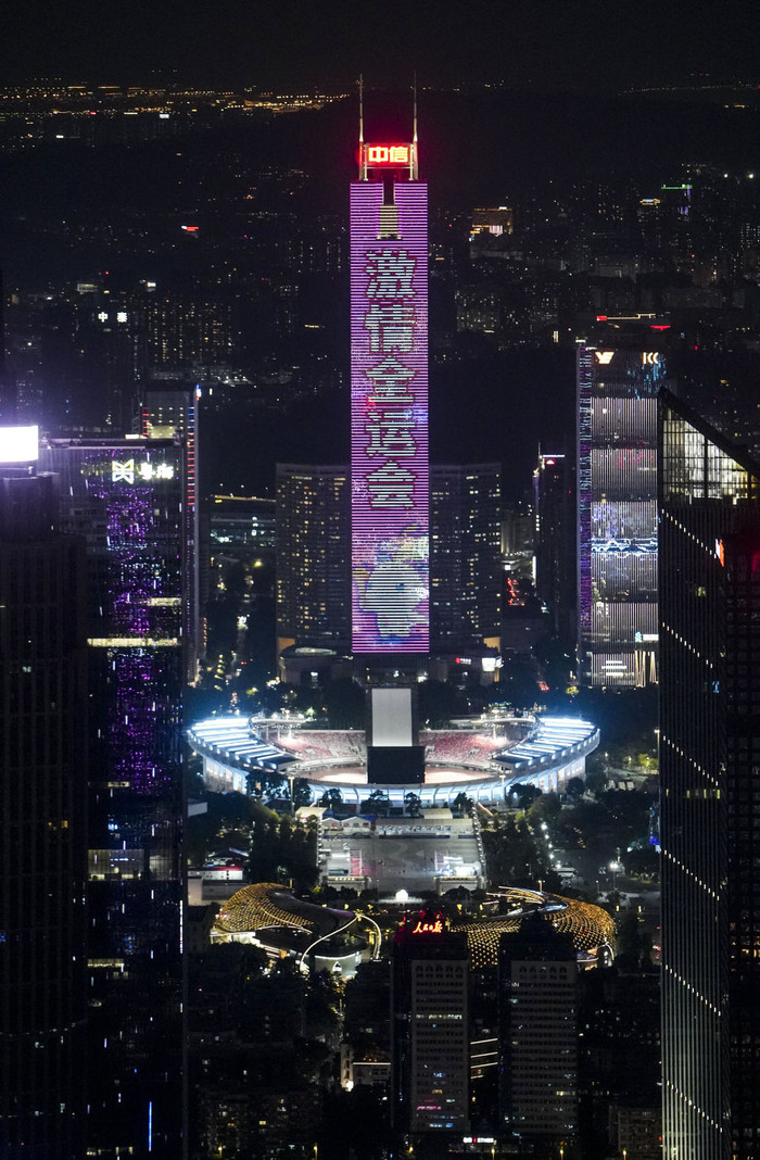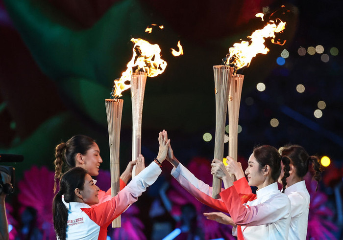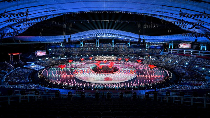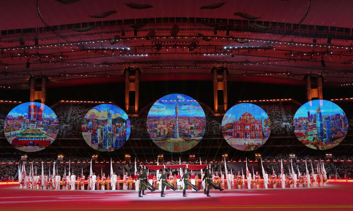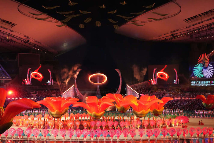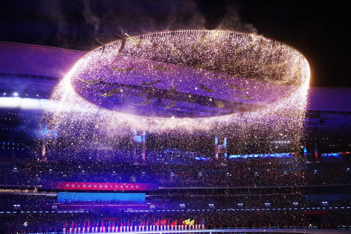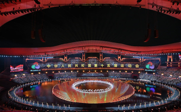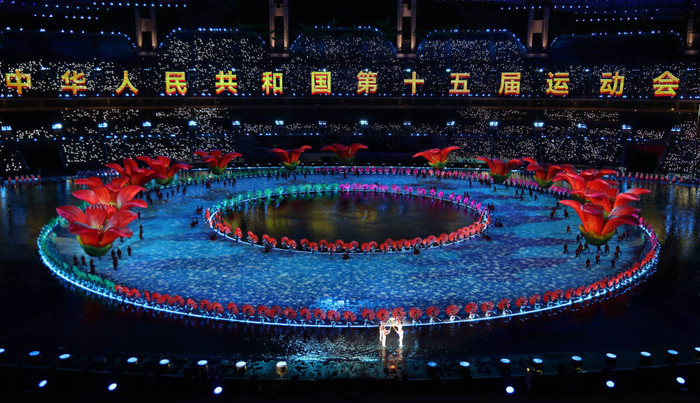 This is the national flag of the People's Republic of China (center), the flag of the Games of the People's Republic of China (left) and the flag of the 15th National Games taken at the opening ceremony. Photo by Xinhua News Agency reporter Deng Hua