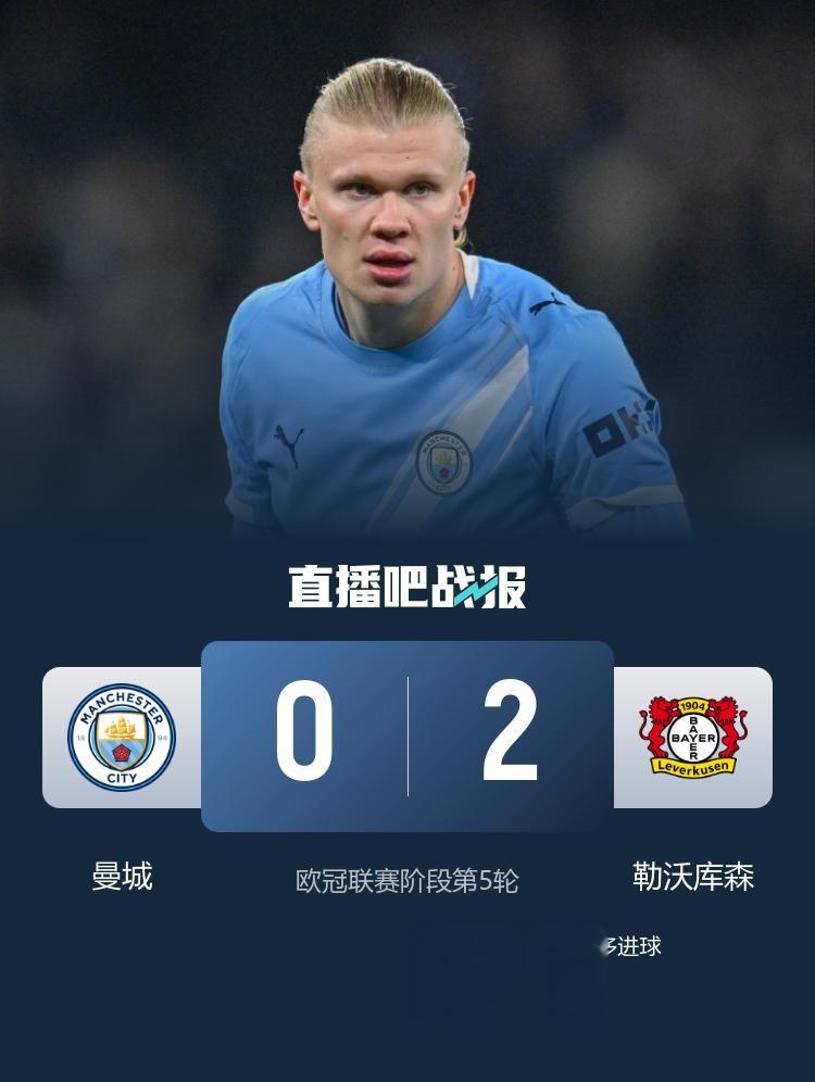 November 26 News At 4 a.m. on November 26, in the fifth round of the UEFA Champions League, Manchester City faced Bayer Leverkusen at the Etihad Stadium. In the first half, Grimaldo opened the scoring. Manchester City trailed Leverkusen 0-1 at halftime. In the second half, Schick expanded the lead, and Haaland, who came on as a substitute, missed a good opportunity to score. In the end, Manchester City lost 0-2 to Leverkusen and suffered their first defeat in the Champions League this season.