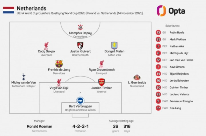 Midfielder: Frenkie de Jong (Barcelona), Gakpo (Liverpool), Kluivert Jr. (Bournemouth), Mullen (Villa), Hrafenberch (Liverpool)