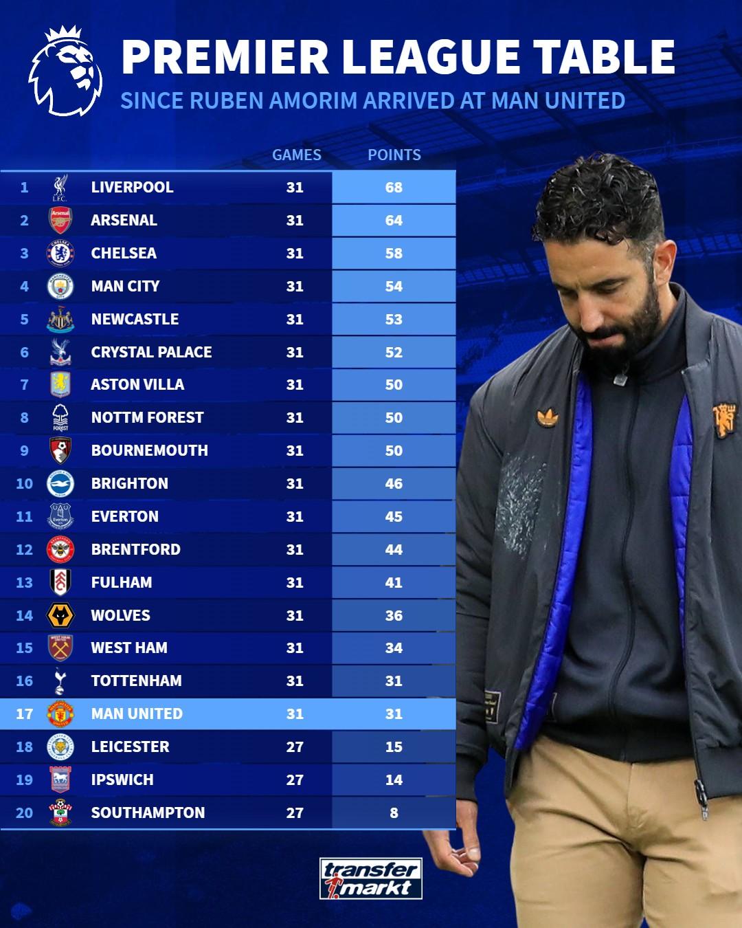 Germany has been ranked 17th in Premier League standings since Amorin coached Manchester United: Manchester United ranks 17th with 31 points