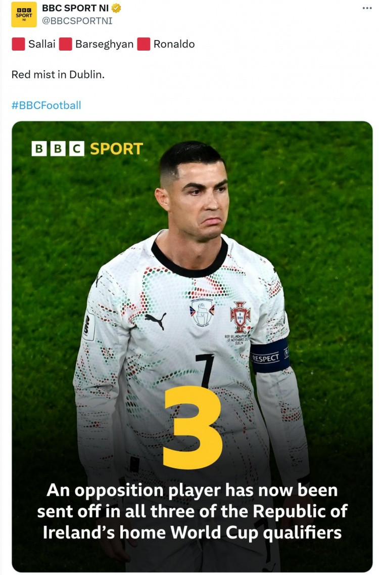 Ireland s three home games in this World Cup preliminaries have opposing players receiving red cards, and Cristiano Ronaldo is the third person among them.