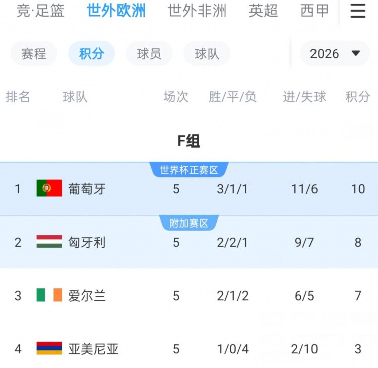 Currently in this group, Portugal continues to lead with 10 points, and Ireland ranks third with 7 points. In Ireland's previous two home games of this World Cup preliminaries, one player from Hungary and Armenia each received a red card. The specific situation is as follows: