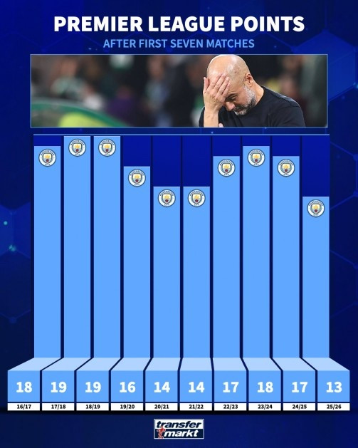 Manchester City has only scored 13 points in the first seven rounds of the Premier League this season, the lowest in the same period since Guardiola coached