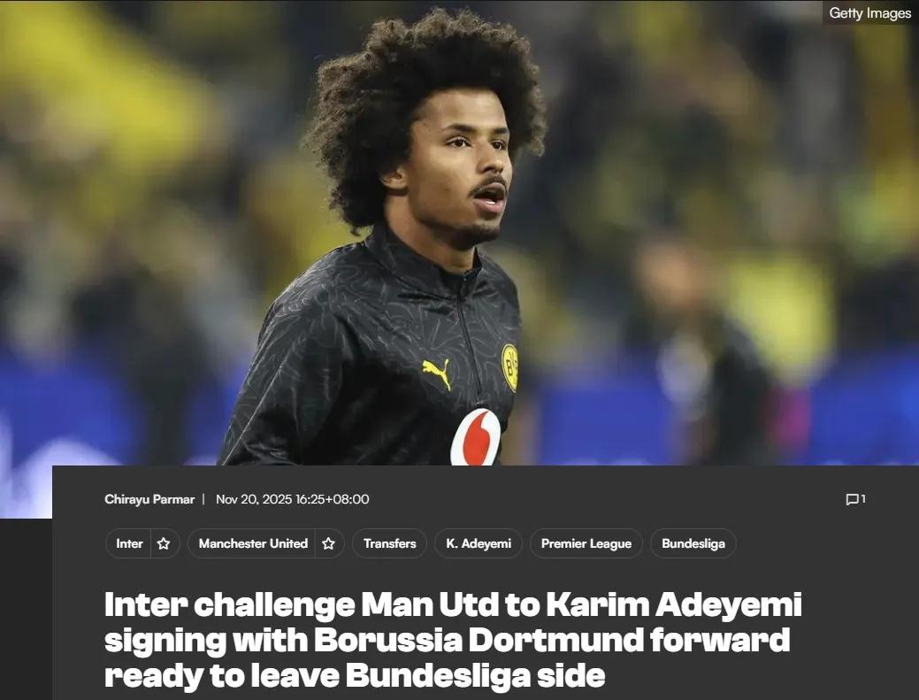 It is reported that Manchester United has initially contacted Adeyemi's agent Mendes, and Bild reported that Inter Milan has also joined the competition and initial negotiations have begun.
