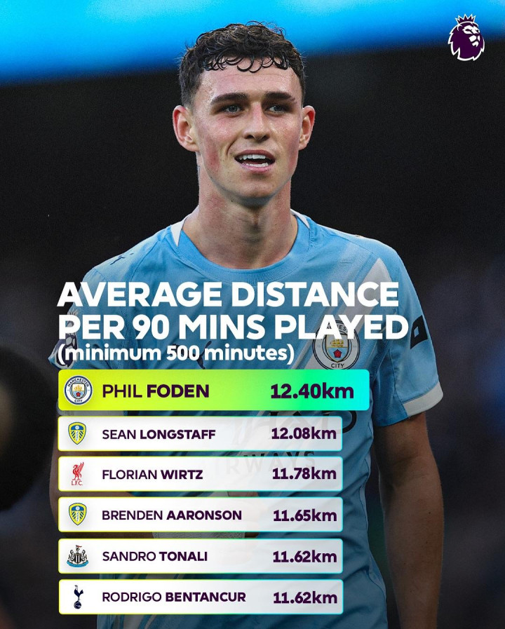 Hupu, October 28th, according to the official statistics of the Premier League, so far this season, the average running distance per game among the top five Premier League players (at least 500 minutes played), Foden ranked first with 12.40km, and Wirtz ranked third.