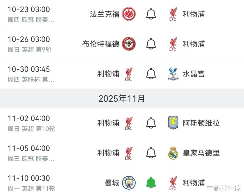 On the contrary, it is Slott. For the first time since coaching Liverpool, I heard the sound of get out of class being dismissed. Although there is no worry about dismissal for the time being, looking at Liverpool's upcoming schedule, people can't help but take a breath for Slott. Midweek is another away game, and the opponent is Eintracht Frankfurt, which has the second most goals in the Bundesliga this season. Even if they can't beat Liverpool, they can still get a bite out of the Red Army; at the weekend, the 9th round of the Premier League is another away game, and the opponent is Brentford, who defeated Manchester United 3-1 at home in the 6th round of the Premier League; and then they have to play in England again. The League Cup will host this season's nemesis Crystal Palace; in the 10th round of the Premier League, Liverpool will need to face Aston Villa at home, which currently has 5 consecutive wins in all competitions; then it will be the 4th round of the UEFA Champions League at home against Real Madrid in midweek; and then it will challenge Manchester City away in the 11th round of the Premier League.