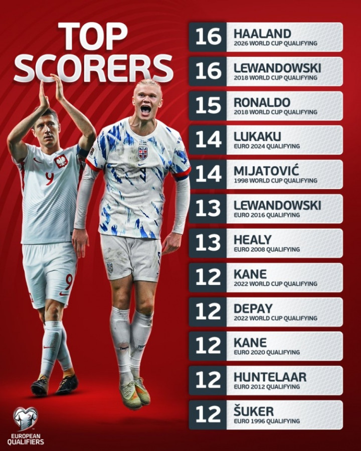 1. Haaland (Norway): 16 goals, 2026 World European Qualifiers